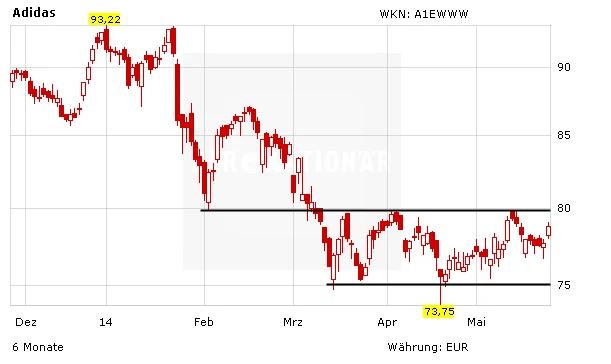 Charttechnisch hat sich die Adidas-Aktie in einem Seitwärtstrend eingependelt. Seit Mitte März bewegt sich der Kurs zwischen 75 und 80 Euro. Während die untere Begrenzung des Korridors nach der Abwärtsbewegung einen stabilen Boden darstellt, hat sich die 80-Euro-Marke als massives Hindernis gezeigt. Bereits mehrfach ist der DAX-Titel beim Erholungsversuch an diesem Widerstand abgeprallt.