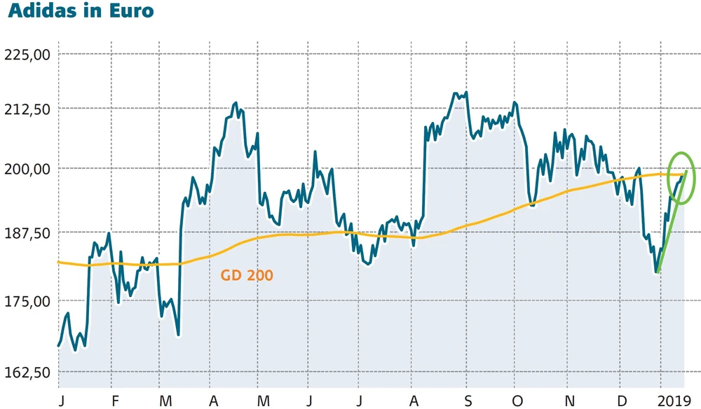 Das Jahr 2019 hat für Adidas-Aktionäre bestens begonnen. Mit einem Plus von neun Prozent liegt die Aktie des Sportartikelherstellers auf Rang 4 im DAX. Der Titel ist kurz davor, die charttechnisch bedeutende 200-Tage-Linie zu überwinden. Die Aussichten für Adidas und die ganze Branche sind nach wie vor ausgezeichnet.