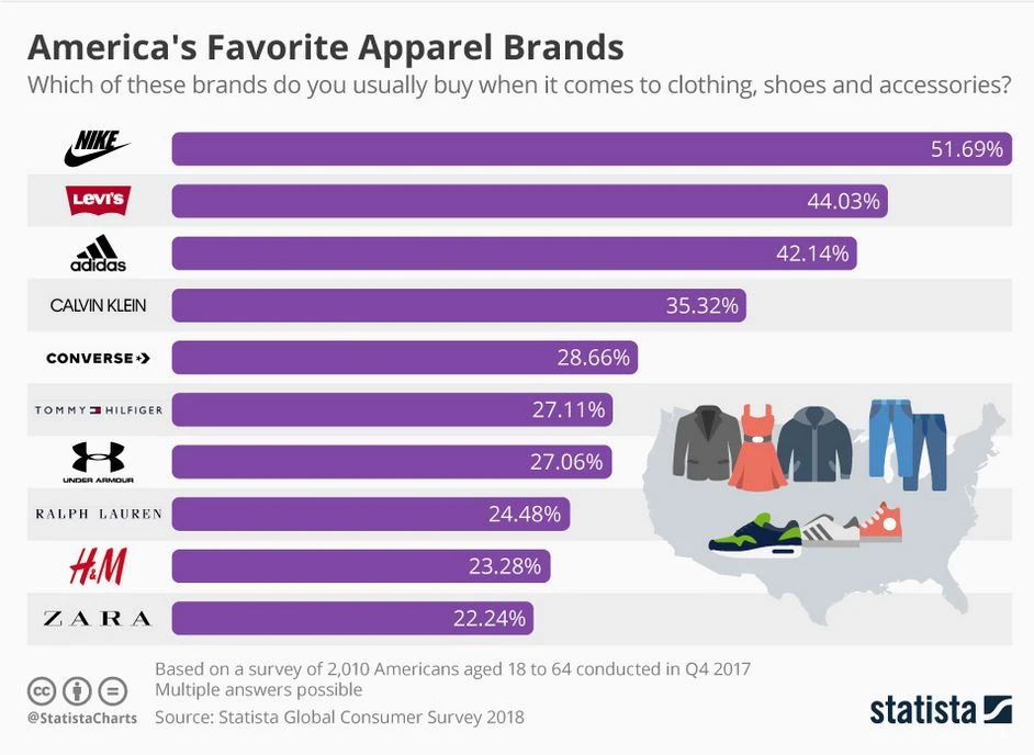 Die Amerikaner lieben Adidas. Auf die Frage, welche Marke sie in der Regel kaufen, wenn sie Kleidung, Taschen und Schuhe shoppen, antworteten 42 Prozent: Adidas. Damit liegen die Herzogenauracher auf Platz 3. Levi’s kommt auf Platz 2, Nike auf Platz 1.