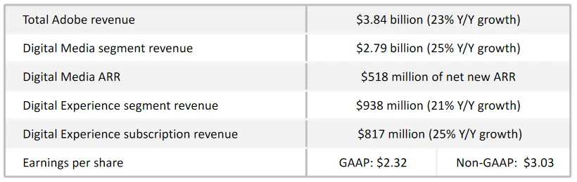 Der Umsatz von Adobe legte im zweiten Quartal 23 Prozent auf 3,84 Milliarden Dollar zu, bei Gewinnen je Aktie von 3,03 Dollar. Damit hat der Software-Konzern sowohl die eigenen Schätzungen als auch die Erwartungen der Analysten übertroffen. Die Wall-Street-Experten rechneten nur mit einem Umsatz von 3,73 Milliarden Dollar bei Gewinnen je Aktie von 2,82 Dollar.