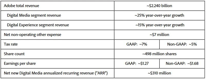 Die Creative Cloud zählte zu den Highlights des zweiten Quartals. Das Angebot in der Programme wie Photoshop oder InDesign angeboten werden, zählt zu den wichtigsten Produkten, da Adobe hier über die Hälfte der Erlöse erwirtschaftet. Daneben stellte die Unternehmensführung ein Nachlassen des Konkurrenzdrucks durch IBM und Oracle im Bereich der Experience Cloud. Auch die Partnerschaft mit Microsoft half laut Adobe-Vorstand Shantanu Narayen.