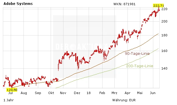 Im zweiten Quartal wuchsen Adobes Umsätze um 24 Prozent auf 2,20 Milliarden Dollar, bei Gewinnen je Aktien von 1,66 Dollar. Damit übertraf der Photoshop-Konzern die Erwartungen der Analysten deutlich – die Experten rechneten mit einem Erlös von 2,16 Milliarden Dollar bei einem EPS von 1,54 Dollar.
