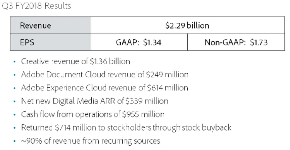 Adobe lieferte Umsätze in Höhe von 2,29 Milliarden Dollar bei Gewinnen je Aktie von 1,73 Dollar. Der Software-Konzern kann damit die Erwartungen der Analysten (2,25 Milliarden Dollar; 1,69 Dollar) auch im dritten Quartal übertreffen. Die Überraschung fällt weniger hoch aus als in der Vergangenheit – doch es ist das neunte Mal in Folge, dass es Adobe gelingt, die Erwartungen zu übertreffen.