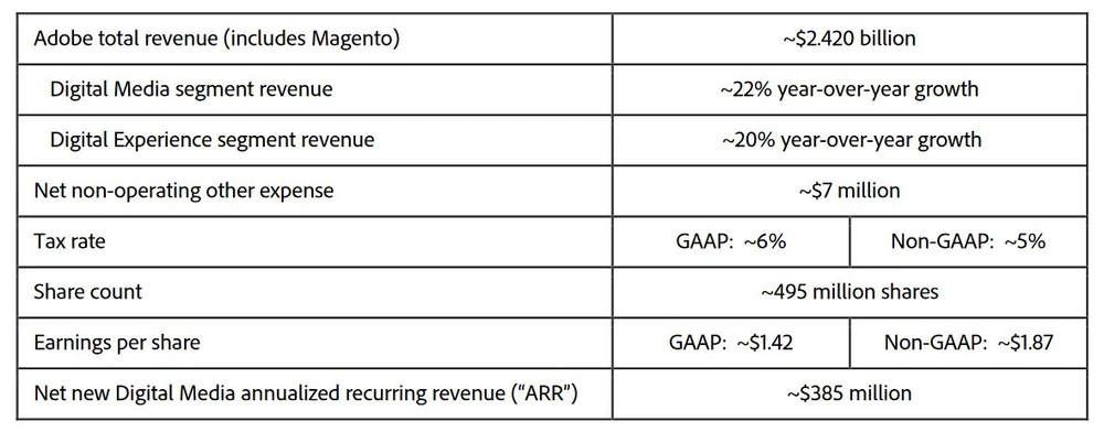 Blickt man auf die einzelnen Segmente, ergibt sich ein ähnliches Bild. Digital Media, wo auch Adobes Creative und Document Coud veranschlagt wurden, lieferte einen Umsatz von 1,61 Milliarden Dollar. Der Großteil stammt dabei aus dem Creative-Segment. Hier erlöst der Photoshop-Entwickler 1,36 Milliarden Dollar – Analysten rechneten mit 1,35 Milliarden Dollar.