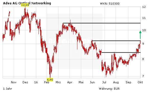 Daher hat sich ADVA-Aktie mittlerweile bis an den charttechnischen Widerstand bei 9,25 Euro vorgearbeitet. Wird diese Hürde überwunden, dürfte sich die Aufwärtsbewegung noch einmal beschleunigen. Der nächste markante Widerstand wartet dann erst im Bereich von 10,50 Euro. DER AKTIONÄR spekuliert im Real-Depot auf weiter steigende Kurse.