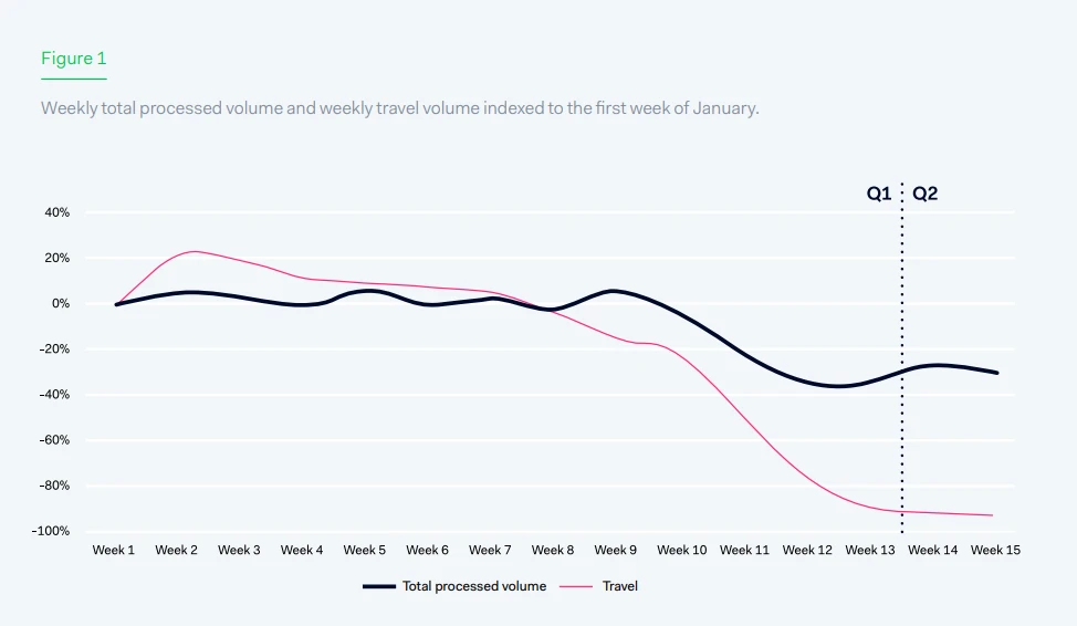 Seit Mitte März seien jedoch die Auswirkungen der Coronakrise zu spüren. Besonders betroffen ist demnach das Reise-Segment, wo das wöchentliche Transaktionsvolumen im Vergleich zum Jahresanfang nahezu kollabiert ist.