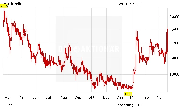 Die im SDAX notierte Aktie verlor am Nachmittag mehr als 14 Prozent. Am Mittwoch war der Kurs um fast 15 Prozent in die Höhe geschossen, nachdem das Unternehmen seine eigentlich für diesen Donnerstag vorgesehene Bilanzvorlage um eine Woche verschoben hatte. Als Grund nannte Air Berlin laufende Gespräche über „Handlungsoptionen, die im Fall ihrer Umsetzung einen wesentlichen Einfluss auf die Gesellschaft haben werden“. Bei der Bilanzvorlage für 2013 erwarteten Branchenexperten erneut rote Zahlen.