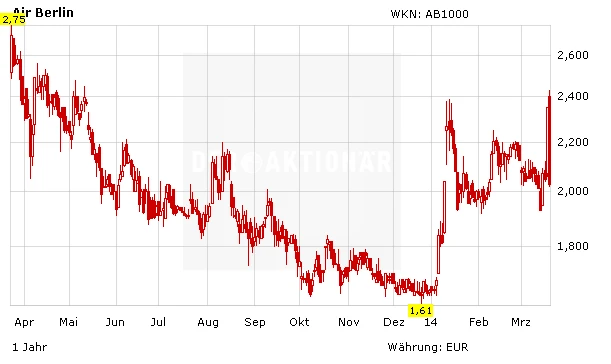 Am Freitag kochten neue Gerüchte auf. So berichteten norwegische Medien, dass die Fluggesellschaft Norwegian Air an Air Berlin interessiert sei. Es fanden angeblich Gespräche zwischen dem Bjorn Kos, CEO der Norwegian Air und dem Management von Air Berlin statt. Der im Fall eines Übernahmeangebots wichtige 30-Tag-Durchschnitt von Air Berlin liegt bei 2,07 Euro. Ein mögliches Übernahmeangebot müsste mindestens zu diesem Kurs abgegeben werden. Air Berlin bleibt derzeit nur für risikofreudige Trader eine Option.