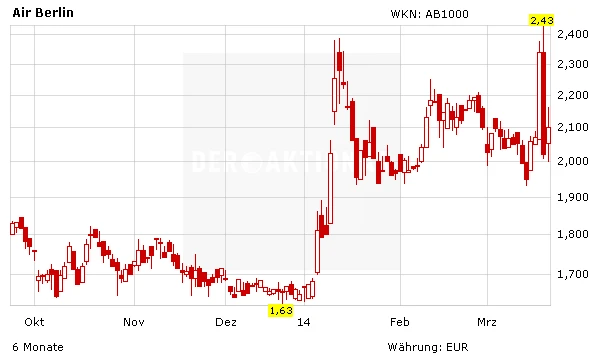 Deutschlands zweitgrößte Fluggesellschaft Air Berlin könnte einem Bericht der Wirtschaftswoche zufolge in eine GmbH umgewandelt werden - und damit nicht mehr an der Börse vertreten sein. Außerdem wolle die arabische Fluggesellschaft Etihad ihre Anteile von 30 auf 49,9 Prozent aufstocken. Kleinaktionäre sollen dem Bericht zu Folge eine Abfindung erhalten werden.