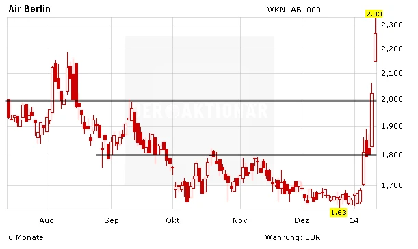 Air Berlin befindet sich bereits seit Tagen im Aufwind. Das Plus auf Jahressicht beträgt bereits mehr als 25 Prozent. Für Unterstützung sorgten die jüngsten Verkehrszahlen. Die Fluglinie zählte im vergangenen Jahr 31,5 Millionen Fluggäste und damit 5,4 Prozent weniger als ein Jahr zuvor. Die Auslastung der Maschinen verbesserte sich jedoch um 1,3 Prozentpunkte auf 84,9 Prozent. Air Berlin hat sich von verlustbringenden Strecken getrennt und versucht mit einem verringerten Flugangebot und einer verkleinerten Flotte in die schwarzen Zahlen zu kommen.