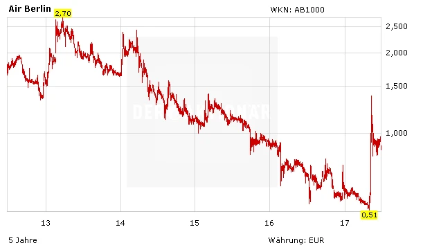 So sei die enorme Schuldenlast von Air Berlin ein Hindernis, ebenso wie auch das zu hohe Kostenniveau der deutschen Nummer 2 und kartellrechtliche Fragen. Diese Aussagen sind für die vielen Zocker, die in der vagen Hoffnung auf eine baldige Übernahme durch die Lufthansa auf Air-Berlin-Aktien gesetzt hatten, natürlich ein herber Rückschlag.