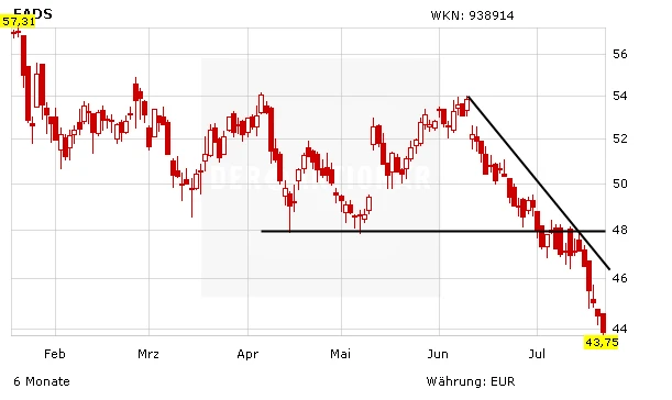 Charttechnisch ist die Aktie von Airbus derzeit weiter angeschlagen. Auch am heutigen Montag verliert das Papier mehr als ein Prozent auf 43,92 Euro. Vor einem Neueinstieg sollten Anleger den nachhaltigen Bruch des kurzfristigen Abwärtstrends und die Rückeroberung der 48-Euro-Marke abwarten.