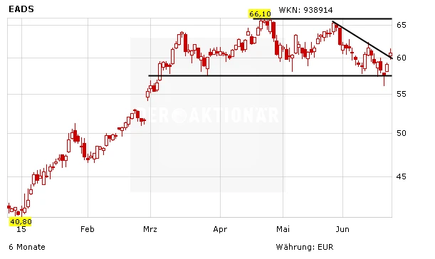 Die Aktie von Airbus kann zum Wochenauftakt kräftig zulegen. Das Papier gewinnt 2,4 Prozent auf 60,51 Euro. Damit wurde nicht nur der kurzfristige Abwärtstrend geknackt, sondern auch die psychologisch wichtige 60-Euro-Marke zurückerobert. Damit dürfte der Wert nun direkt Kurs auf das erst im April dieses Jahres bei 66,10 Euro markierte Allzeithoch nehmen. DER AKTIONÄR sieht für die kommenden zwölf Monate aber noch deutlich mehr Potenzial und empfiehlt, bei der Airbus-Aktie mit einem Stopp bei 48 Euro investiert zu bleiben.