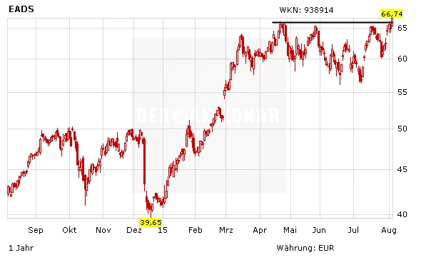 Die Aktie von Airbus hatte sich bereits in den vergangenen Wochen mehrmals am Sprung über das im April dieses Jahres markierte Allzeithoch versucht, bislang war dies allerdings nicht gelungen. Am Mittwoch folgte schließlich der große Sprung nach oben. Bei 66,74 Euro wurde ein neuer Rekordstand erreicht und damit ein Kaufsignal generiert. Zuletzt haben auch einige Analysten das Papier näher unter die Lupe genommen. Die Meinung war dabei einhellig: kaufen.