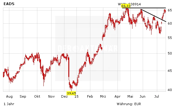 DER AKTIONÄR schätzt das Potenzial der Airbus-Aktie etwas größer ein und sieht das Kursziel bei 80 Euro. Mit dem jüngsten Sprung über den kurzfristigen Abwärtstrend hat der Titel ein neues Kaufsignal generiert. Die Aktie befindet sich jetzt direkt unter dem im April dieses Jahres bei 66,10 Euro markierten Allzeithoch. Kann der Wert auch diese Marke knacken, dürfte sich die Aufwärtsdynamik noch einmal verstärken. Anleger sollten die Gewinne mit einem Stopp bei 51,00 Euro laufen lassen.