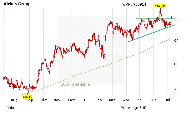 Die Airbus-Aktie springt am Dienstag um gut zweieinhalb Prozent nach oben und damit locker wieder über die 100-Euro-Marke sowie den Widerstand bei 101 Euro. Ein neues Allzeithoch jenseits von 106,42 Euro dürfte nur noch eine Frage von Tagen sein. Auch DER AKTIONÄR bleibt mit seinem Kursziel von 125 Euro weiterhin optimistisch.