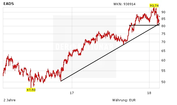 So wird die Dividende von 1,35 auf 1,50 Euro angehoben. Ebenfalls erfreulich für die Aktionäre: Konzernchef Tom Enders kündigte an, im laufenden Jahr 800 Flugzeuge ausliefern zu wollen (Vorjahr: 718 Maschinen). Zudem soll das bereinigte EBIT – nach dem Zuwachs von acht Prozent auf 4,25 Milliarden Euro im vergangenen Jahr – 2018 um satte 20 Prozent gesteigert werden. Zur kompletten Unternehmensmeldung.