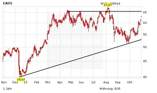 Die Papiere von Airbus legen weiter zu. Mit den starken Zahlen bestätigt der Konzern die gute Stimmung in der Branche. Hinzu kommen die vollen Auftragsbücher. Charttechnisch wartet der nächste Widerstand bei rund 65,50 Euro. Gelingt der Sprung über diese Marke, ist das Allzeithoch nicht mehr fern. DER AKTIONÄR bleibt bullish und sieht Potenzial bis in den Bereich von 80 Euro.