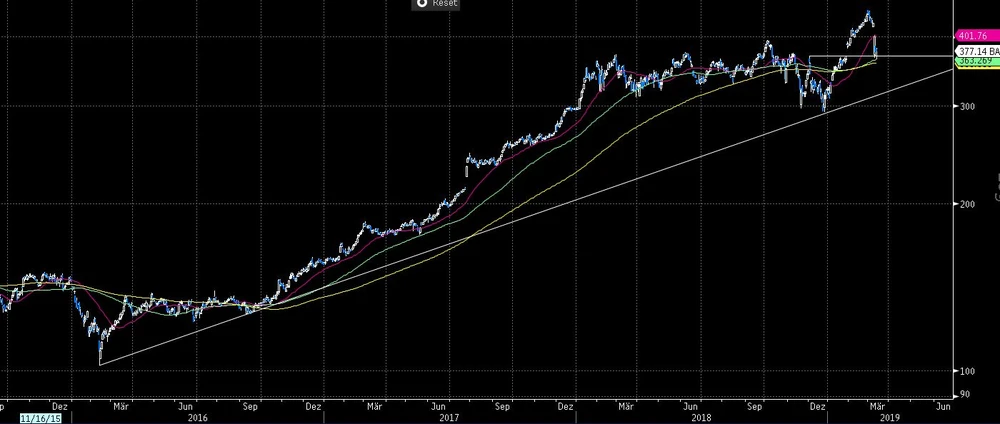 Charttechnisch betrachtet sah es bei Boeing lange Zeit hervorragend aus. Doch mittlerweile hat der Wind gedreht. Nun wäre es wichtig, dass die Aktie nicht nachhaltig unter die 200- und 90-Tage-Linien fällt, die aktuell bei 362 und 359 Dollar verlaufen. Halten diese nicht, so droht ein weiterer Kursrückgang. Die nächste Unterstützung n Form des seit 2016 gültigen Aufwärtstrend verläuft aktuell bei etwa 313 Dollar.
