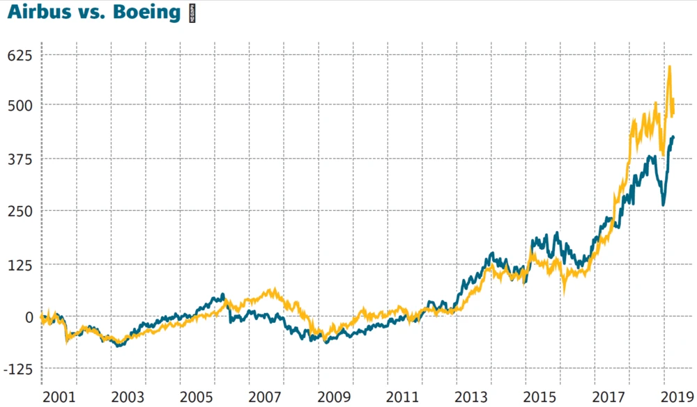 So startete die Airbus-Aktie bereits Anfang Februar allmählich die Aufholbewegung (siehe Chart unten), die natürlich im Zuge des zweiten Unglücks und der damit verbundenen Flugverbote beschleunigt wurde. Während die Boeing-Aktie derzeit darum kämpft, einen Boden auszubilden, glückte Airbus kürzlich sogar ein frisches Kaufsignal in Form eines neuen Allzeithochs. Angesichts der Tatsache, dass die Dow-Jones-Titel trotz der schwerwiegenden Probleme und der geringeren Wachstumsdynamik mit einem 2020er-KGV von 17 genauso hoch bewertet sind wie die Airbus-Anteile, stehen die Chancen sehr gut, dass Airbus noch längere Zeit besser laufen wird als Boeing.