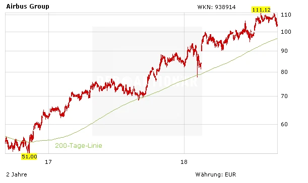 Aktionäre können sich weiterhin über die fantastische Entwicklung der Airbus-Aktie freuen. Seit der Erstempfehlung des AKTIONÄR im November 2016 konnten die Papiere des Flugzeugbauers rund 87 Prozent zulegen. Investierte Anleger geben keine Stücke aus der Hand und lassen die Gewinne mit einem Stopp bei 83,50 Euro laufen. Kursziel: 130 Euro.