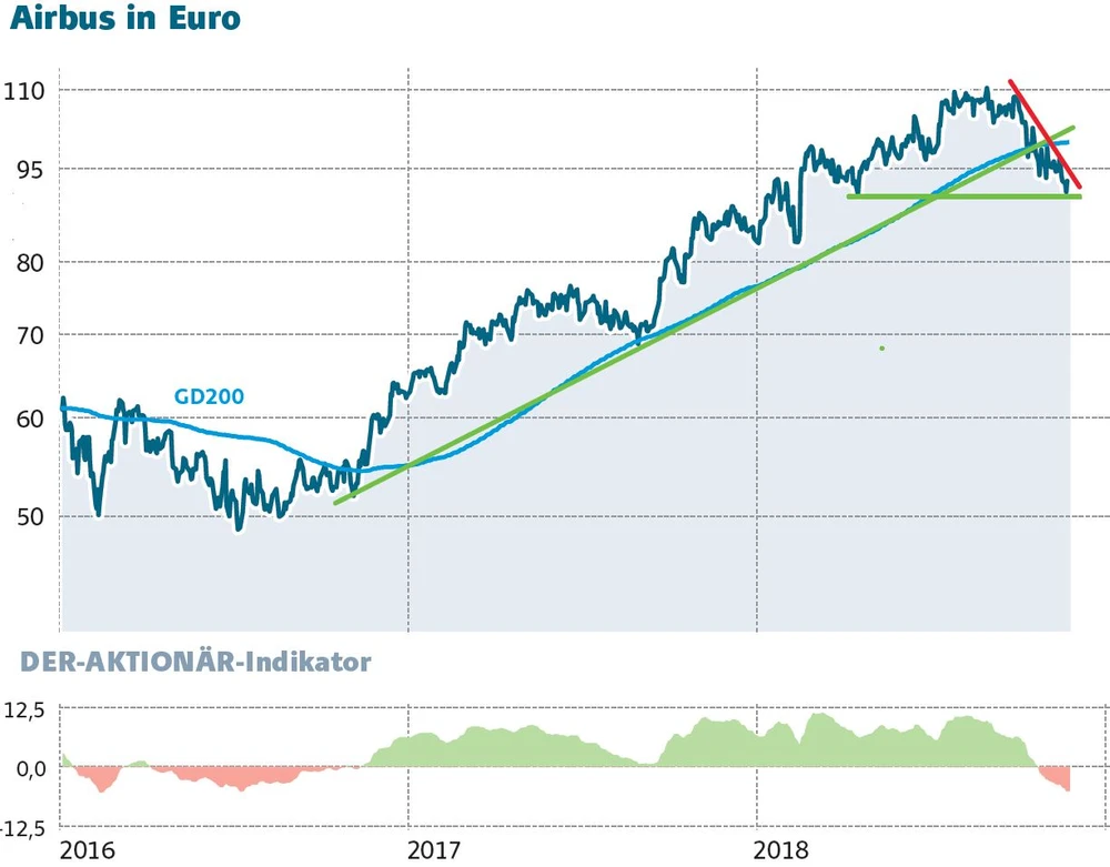 Die Airbus-Aktie machte einen Kurssprung um mehr als zwei Prozent auf gut 93 Euro, nachdem sie am Vortag noch kurzzeitig unter die 90-Euro-Marke abgesackt war. Der Abwärtstrend seit Ende September ist jedoch noch intakt. Im Oktober wurde ein langfristiger Aufwärtstrend gebrochen. DER AKTIONÄR hält die Airbus-Aktie dennoch für aussichtsreich und hat als längerfristiges Ziel 130 Euro ausgegeben. Eine Stopp-Loss-Order sollte bei 83,50 Euro gesetzt werden.