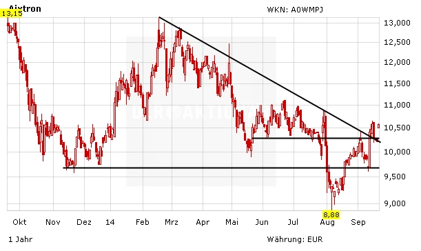 Trotz der Zugewinne in den letzten Tagen bietet sich ein Einstieg bei Aixtron weiterhin nur risikofreudigen Anlegern an. Operativ und charttechnisch hat sich die Erholung noch nicht als nachhaltig erwiesen. Auch die Übernahmegerüchte hatten zuletzt meist keine lange Halbwertzeit.