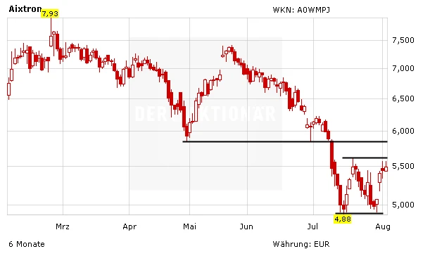Charttechnisch betrachtet könnte Aixtron kurz vor dem Abschluss einer kleinen W-Formation stehen. Am 15. und am 30. Juli jeweils markierte die Aktie bei 4,88 Euro ein Bewegungstief. Um eine solche Formation ausbilden zu können, müsste der Kurs zeitnah das Zwischenhoch vom 20. Juli bei 5,60 Euro überwinden. Im Anschluss wäre Luft bis 5,84 Euro (Tiefs von Mai und Juni).