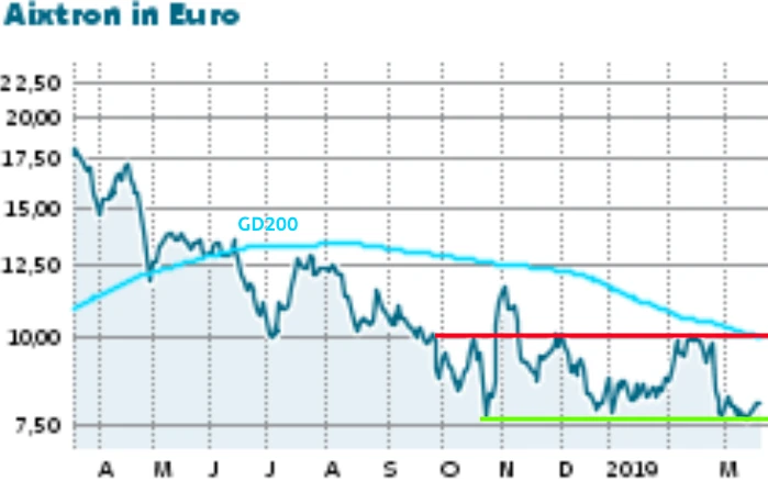 Bei Aixtron tut sich was. Die Aktie zuckt. Aus dem Zucken könnte in den nächsten Tagen mehr werden. Die Deutsche Bank hat ihre Kaufempfehlung mit Ziel 14,00 Euro bestätigt. Doch die Begründung hat es in sich: Beim Treffen mit Investoren habe sich der Vorstand trotz seiner gewöhnlich zurückhaltenden Kommunikationspolitik sehr zuversichtlich zu den mittelfristigen Aussichten geäußert. Die Hoffnung steigt, dass die Investitionszurückhaltung der Kunden doch nur vorübergehender Natur ist.
