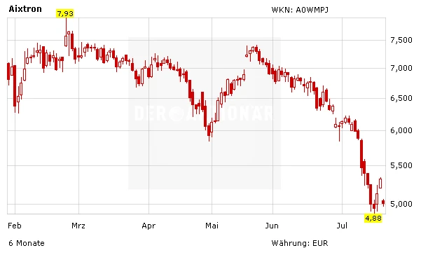 Dass Aixtron seine Prognosen bestätigt, erscheint auf den ersten Blick sehr ambitioniert. Hier besteht aus Sicht des AKTIONÄR ein hohes Enttäuschungspotenzial im zweiten Halbjahr. Die Aixtron-Aktie notiert derzeit auf dem tiefsten Stand seit mehr als sechs Jahren. Wichtig ist, dass die Unterstützung bei 4,88 Euro hält.