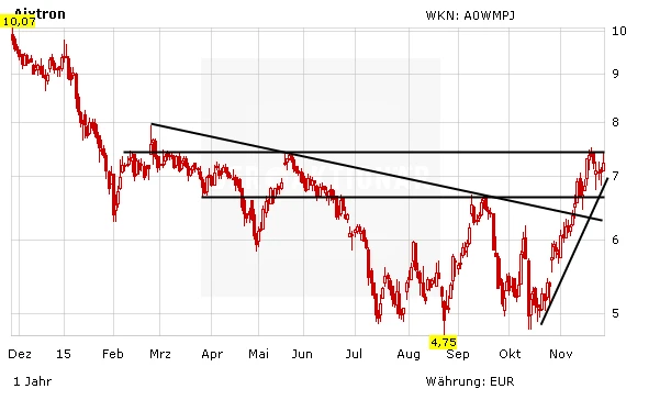 Charttechnisch hat sich das Bild in den letzten Wochen ohnehin deutlich aufgehellt. Seit dem Bruch des Abwärtstrends hat der Titel die Rallye noch einmal beschleunigt. Am Donnerstag kam es im frühen Handel bereits zum Test des massiven Widerstands bei 7,50 Euro. Auch wenn dieser zunächst noch nicht überwunden werden konnte, dürfte die nächste Attacke nur eine Frage der Zeit der sein. Nach unten sichert derweil die Unterstützung bei 6,70 Euro vor größeren Rücksetzern ab. Zudem gibt der kurzfristige Aufwärtstrend seit Oktober weiteren Support.