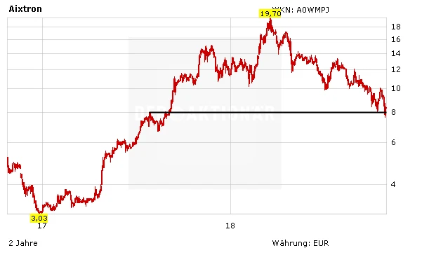 Wie geht es weiter? Am kommenden Dienstag (30. Oktober) präsentiert der Hersteller von Produktionsanlagen für die Halbleiterbranche seine Zahlen zum dritten Quartal. DER AKTIONÄR rechnet mit einem ordentlichen Auftragseingang und hält die Marktbefürchtungen hinsichtlich der Branche für übertrieben. Nach dem deutlichen Kursrückgang, für 2017 steht ein Minus von über 30 Prozent zu Buche, und einem durchschnittlichen jährlichen Gewinnwachstum von über 35 Prozent ist die Bewertung mit einem 2019er-KGV von 25 keinesfalls zu hoch.