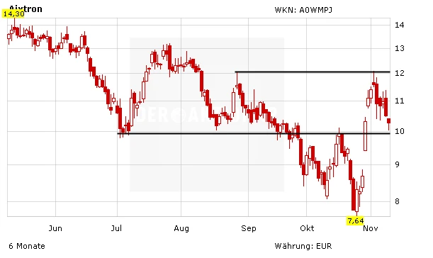 Wie geht es kurzfristig weiter? Neben Neuigkeiten zur operativen Entwicklung sorgen bei Aixtron vor allem Analysteneinschätzungen und die Aktivitäten der Leerverkäufer für die entsprechenden Impulse. Erweist sich die 10-euro-Marke als tragfähig, dann könnte der Kurs in den nächsten Tagen und Wochen in eine ausgedehnte Seitwärtsbewegung übergehen und dabei zwischen zehn und zwölf Euro pendeln.