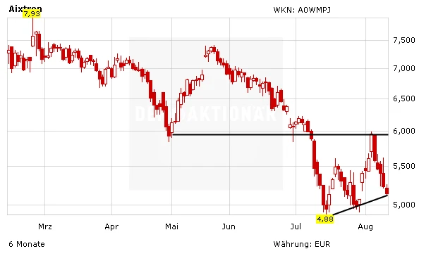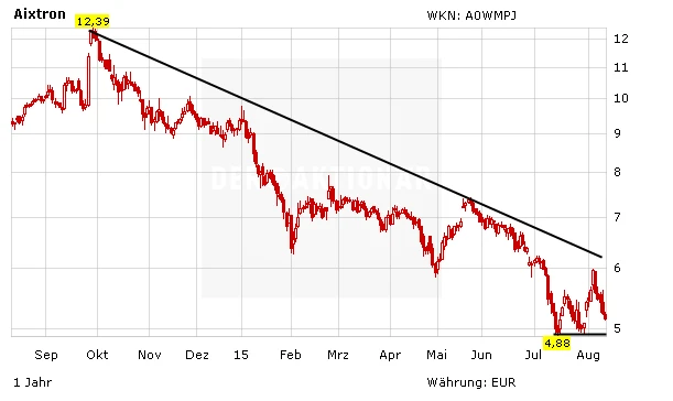 Das am 15. und 30. Juli bei 4,88 Euro markierte Bewegungstief und zugleich auch 52-Wochen-Tief hat der TecDAX-Titel nicht unterschritten. Noch allerdings ist der seit dem Jahreshoch ausgebildete Abwärtstrend intakt.