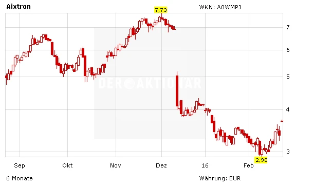 Problematisch ist bei dem Unternehmen der Auftragseingang, der im vergangenen Jahr um ein Sechstel auf 167,1 Millionen Euro zurückging. Im Dezember musste Aixtron einen herben Rückschlag wegen der Stornierung einer Großbestellung aus China einstecken. Neue Maschinen hatten die Anforderungen des Kunden in Tests nicht erfüllt. Daraufhin hatte die Aktie massiv an Wert verloren.