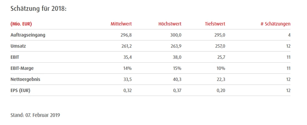 Am 26. Februar gewährt Aixtron einen Einblick in die jüngste Geschäftsentwicklung. Der Vorstand prognostiziert im Vorfeld bei Gesamtaufträgen in Höhe von 290 Millionen einen Umsatz von rund 260 Millionen Euro. Die Bruttomarge soll rund 40 Prozent des Umsatzes betragen. Zudem werden ein EBIT zwischen 35 und 40 Millionen Euro und ein positiver Gesamtcashflow erwartet. Die Schätzungen der Experten für 2018 gehen weit auseinander: