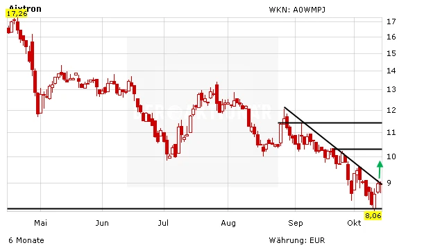 DER AKTIONÄR hält an seinem Fazit fest: Nach dem deutlichen Kursrückgang überwiegen auf dem aktuellen Niveau die Chancen. Die nächsten belastbaren Zahlen von Aixtron gibt es am 30. Oktober. DER AKTIONÄR spekuliert im Real-Depot auf steigende Kurse.