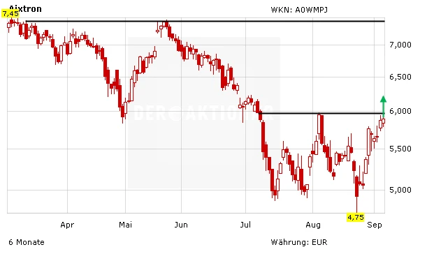 Die Gerüchteküche rund um die Entwicklung des Spezialmaschinenbauers Aixtron kommt nicht zur Ruhe. Mittlerweile konnte sich die TecDAX-Aktie von ihren Tiefstständen lösen und hat die 6-Euro-Marke fest im Visier. Gelingt der Sprung über den charttechnischen Widerstand, wäre der Weg Richtung 7,30 Euro geebnet.