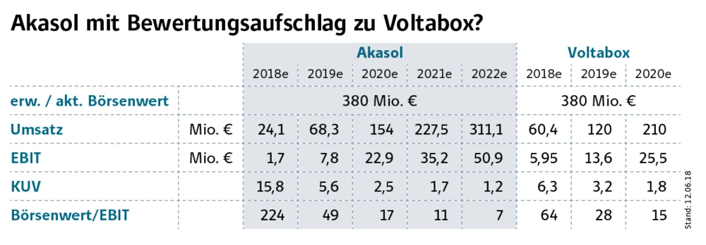 Am besten vergleichbar ist Akasol mit Voltabox, wobei Voltabox neben Bussen vor allem Kommunalfahrzeuge, Baumaschinen, Gabelstapler und Ähnliches im Visier hat, während Akasol mit Bussen, Nutz- und Schienenfahrzeugen den potenziell interessanteren Markt bedient. Voltabox wird an der Börse mit 380 Millionen Euro gehandelt, was mit Blick auf die Geschäftsjahre 2019 und 2020 einem KGV von 28 beziehungsweise 15 entspricht.