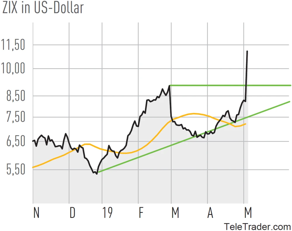 Sicherheit ist wertvoll wie nie! Die Investitionen von Firmen und Behörden in ZIX-Lösungen reißen nicht ab. Die in der AKTIONÄR-Ausgabe 52/18 („Favoriten der Redaktion“ – siehe Bild) vorgestellte Sicherheitssoftware-Aktie hat innerhalb weniger Tage 30 Prozent zugelegt. Denn das Anfang Mai vorgelegte Q1 lief exzellent. Rein das ZIX-Geschäft mit E-Mail-Verschlüsselungen und Cloud-Services wuchs um zehn Prozent auf 18,4 Millionen Dollar. Hinzu kommen die ersten Effekte der gekauften AppRiver: Insgesamt nahm der Umsatz um 76 Prozent zu – operativ lag das kommbinierte Wachstum von Zix und AppRiver bei 14 Prozent. Auch erste Synergieeffekte sind erkennbar: Das EBITDA stieg überproportional um 20 Prozent auf 5,8 Millionen Dollar.