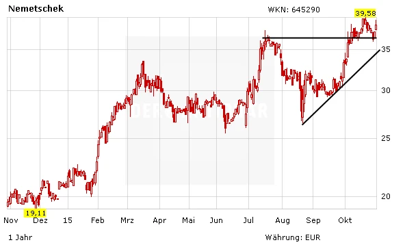 Die Geschäfte bei Nemetschek laufen glänzend. Mit dem Rückenwind der heutigen Zahlen sollte die Aktie bald ein neues Allzeithoch aufstellen. DER AKTIONÄR bleibt enstprechend bullish und setzt im Aktien-Musterdepot auf steigende Kurse. Seit der Aufnahme liegt der Titel bereits knapp 20 Prozent im Plus.