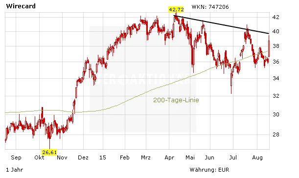 Aber auch dieser dürfte bald der Vergangengeit angehören, schenken Anleger der jüngsten Analystenstimme Glauben. So hat Lars Dannenberg von der Privatbank Hauck & Aufhäuser Wirecard nach Zahlen auf "Buy" mit einem Kursziel von 55,50 Euro belassen. Die endgültige Bilanz für das zweite Quartal des Zahlungsabwicklers habe den vorab veröffentlichten Eckzahlen entsprochen, schrieb Dannenberg in einer Studie vom Dienstag. Wie erwartet habe das Management die erst kürzlich angehobenen Jahresziele bestätigt. Sein Anlageurteil begründete er damit, dass die zahlreichen Wachstumschancen des Unternehmens im aktuellen Kurs noch nicht ausreichend eingepreist seien. Zudem sollten die umfangreichen Aktienkäufe des Vorstandschefs zum Vertrauen der Anleger beitragen.