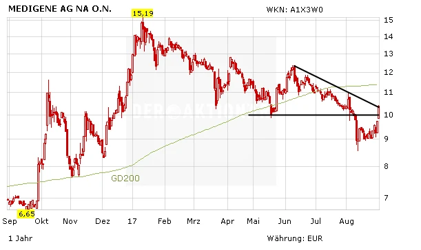 Bereits am Mittwoch hat die TecDAX-Aktie ordentlich zugelegt. Am heutigen Donnerstag nun gelingt dem Titel der Sprung über den ersten wichtigen Widerstand bei zehn Euro. Was war der Auslöser? Nach langer meldungsloser Zeit erfreute Medigene die Anleger mit der Ankündigung, dass die Gesellschaft auf dem kommenden CAR-TCR Summit vom 5. bis 8. September in Boston, MA, USA die Verwendung ihrer automatisierten Hochdurchsatz-Screening (HTS)-Plattform zur Identifizierung von T-Zellrezeptoren (TCRs) demonstrieren wird. Die Aktie beflügelt dürfte insbesondere auch der Kommentar der Vorstandsvorsitzenden Dolores Schendel haben. Sie hat auf die jüngsten Erfolge von Novartis und Kite Pharma bei der CAR-T-Zelltherapie verwiesen. Das sorgte natürlich für neue Fantasie, weil Kite Pharma ja gerade von Gilead für fast zwölf Milliarden Dollar übernommen wurde. Medigene ist derzeit für gerade einmal rund 230 Millionen Euro zu haben.