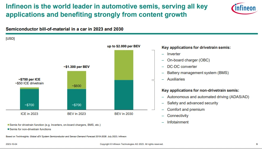 Die Autosparte steht für knapp die Hälfte vom Umsatz bei Infineon. Mit einem Marktanteil von gut zwölf Prozent der DAX-Konzern der größte Anbieter von Chips für die Autoindustrie weltweit. Besonders wichtig: moderne E-Autos enthalten immer mehr Chips. So stecken in einem Elektrofahrzeug aktuell Halbleiter im Wert von rund 1300 Dollar, bis Ende des Jahrzehnts könnten es dem Vernehmen nach sogar bis zu 2000 Dollar werden.