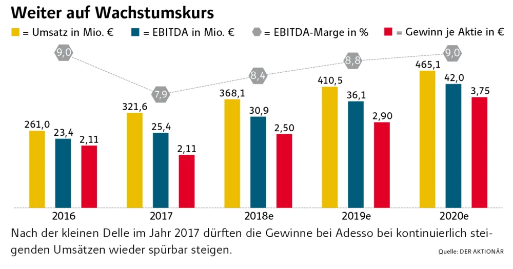 gesteigert. Dabei wurde der Gewinn sogar um jährlich 27 Prozent erhöht. Dieser Trend dürfte sich nach einer kleinen Delle im Jahr 2017 fortsetzen. Für das Jahr 2018 plant Adesso mit mindestens um neun Prozent auf über 350 Millionen Euro steigenden Erlösen. Dabei soll das EBITDA auf 27,7 Millionen Euro steigen (Vorjahr: 25,4 Millionen Euro). Daraus würde eine EBITDA-Marge von 7,9 Prozent resultieren. Doch diese Planung scheint recht konservativ.