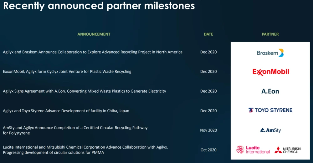 In den letzten Monaten hat Agilyx viele spannende Deals eingefädelt. Das Unternehmen setzt sich zum Ziel, im Durchschnitt jedes Quartal ein neues Projekt in die Entwicklung zu überführen.