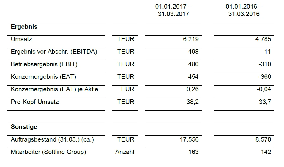 Dieser Trend setzte sich im ersten Quartal des laufenden Jahres fort. Heute wurde bekannt, dass die Gesellschaft ihre Umsatzerlöse auf 6,2 Millionen Euro (Vorjahr: 4,8 Millionen Euro) gesteigert hat. Dies ist insbesondere auf die Stärkung der Position und den Ausbau der Marktpotentiale in den Kernportfoliobereichen zurückzuführen. Das EBITDA erhöhte sich um knapp 0,5 Millionen Euro von 11.000 Euro im ersten Quartal 2016 auf 0,498 Millionen Euro im ersten Quartal 2017 und liegt damit 0,2 Millionen Euro über dem Plan. In Folge dieser positiven Entwicklung verbesserte sich das Konzernergebnis deutlich auf 0,454 Millionen Euro (Vorjahr: minus 0,366 Millionen Euro).