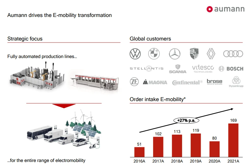 Zu den Kunden gehört daher alles, was in der Branche Rang und Namen hat: von BMW, Mercedes, VW über Porsche, Renault, Stellantis, Scania bis hin zu Vitesco, Bosch und Continental. In der Vergangenheit standen dabei die namentlich nicht genannten vier größten Kunden für rund 40 Prozent der Umsätze. Im zweiten Segment Classic (Umsatzanteil: rund 30 Prozent) fertigt Aumann automatisierte Fertigungslinien für die Bereiche Automotive, Verbraucherelektronik, Haushaltsgeräte und weitere Industriezweige.
