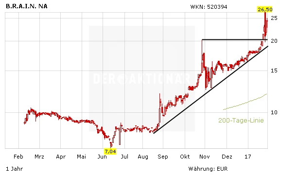 Im Rahmen der Titelstory „Bis zu 120 Prozent mit Hot-Stocks“ wurde die BRAIN-Aktie vorgestellt. Seit der Empfehlung konnten Anleger Kursgewinne von über 30 Prozent einfahren. Nach dem phänomenalen Kursanstieg sind die Papiere allerdings reif für eine Korrektur. Spekulative Anleger agieren mit Abstauberlimits, um noch günstig in den Wert einsteigen zu können.