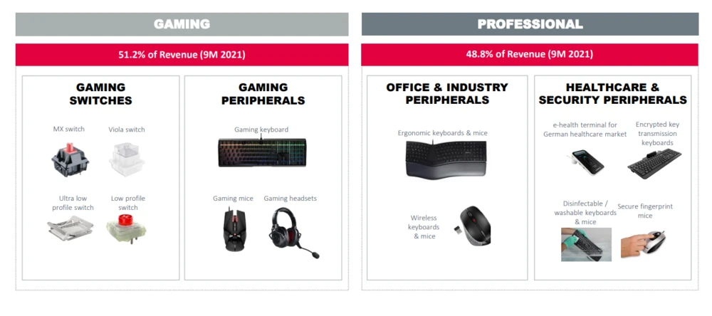 Ähnlich wie im Gaming-Geschäft werden die Premium-Peripheriegeräte der Marke Cherry (Geschäftsfeld Professional) – nicht zuletzt dank dem Trend zum Homeoffice – zunehmend im Office-Bereich genutzt. Die fortschreitende Digitalisierung im deutschen Gesundheitswesen ist im Bereich Digital Health ein weiterer Wachstumstreiber. Cherry ist hier einer von nur zwei durch das BSI qualifizierten Peripheriegeräteanbietern für den Aufbau einer sicheren Telematikinfrastruktur.